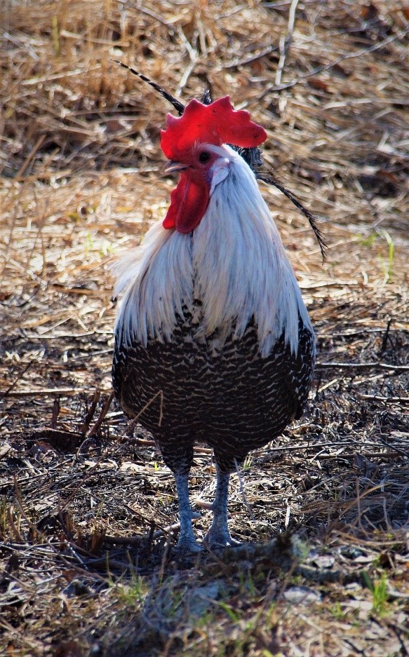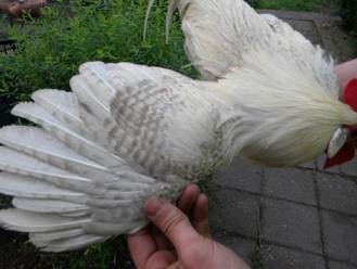 Selle valgejutilise hõbedase (all) bantam kuke sulestiku jutilises mustris ja sabaosas on liiga palju halli.