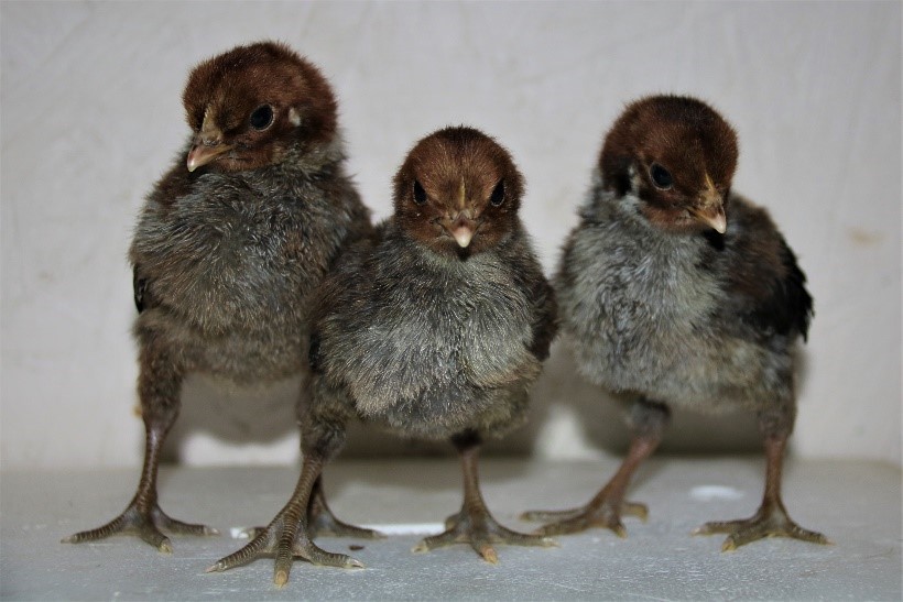 Bantami noorkanad kenasti küljele vajunud harjadega; pöörake tähelepanu eesmise noorkana harja pigmendile.
