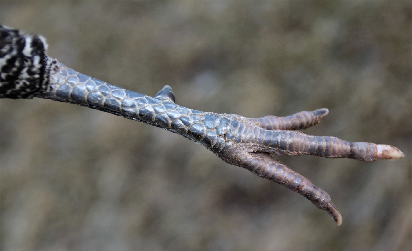 Jalad ja varbad pikad ning plii sinise värvusega. Kannused on kukkedel hästi arenenud.
