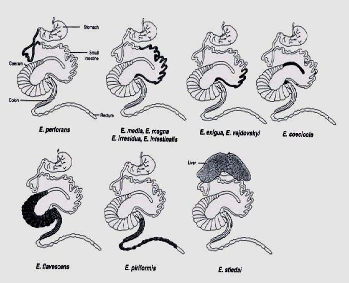 Järgneval pildil on näha, kus erinevat liiki eimeeriad sooltes ja maksas paiknevad, pildil on nad kujutatud tumedalt.