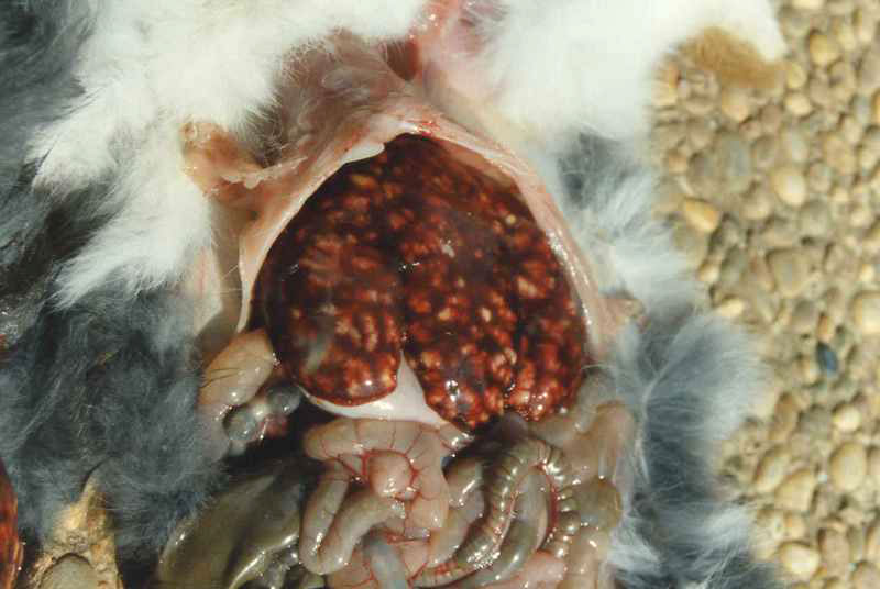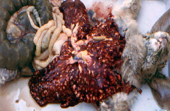 Fotol koktsidioosi poolt kahjustatud küüliku sooled.